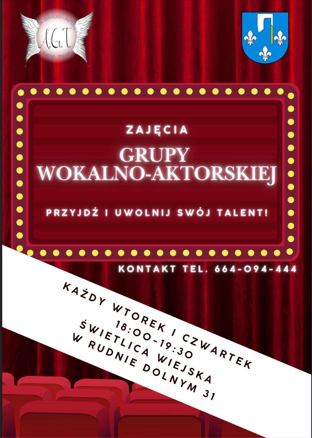 Zajęcia GRUPY WOKALNO-AKTORSKIEJ Przyjdź i uwolnij swój talent kontakt: 664-094-444 Każdy wtorek i czwartek 18:00-19:30 Świetlica Wiejska w Rudnie Dolnym 31