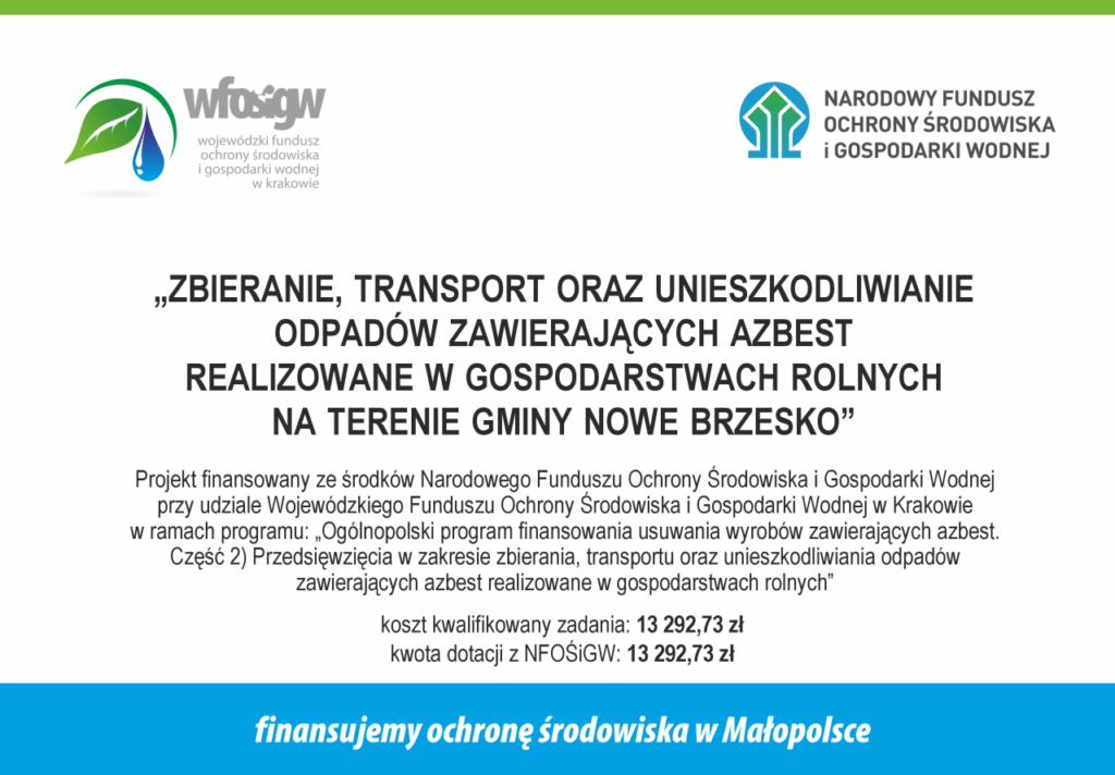 Projekt finansowany ze środków Narodowego Funduszu Ochrony Środowiska i Gospodarki Wodnej przy udziale Wojewódzkiego Funduszu Ochrony Środowiska i Gospodarki Wodnej w Krakowie w ramach programu: „Ogólnopolski program finansowania usuwania wyrobów zawierających azbest. Część 2)Przedsięwzięcia w zakresie zbierania, transportu oraz unieszkodliwiania odpadów zawierających azbest realizowane w gospodarstwach rolnych”